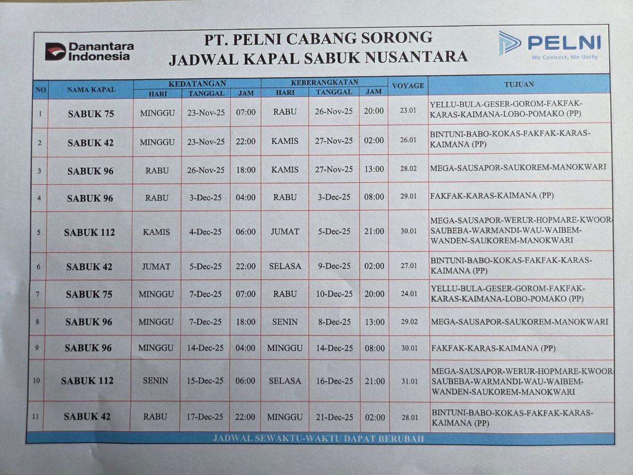 Sorong – PT. Pelayaran Nasional Indonesia (PELNI) Cabang Sorong resmi mengumumkan jadwal lengkap kapal PELNI dan kapal perintis dari Sorong menuju seluruh rute di Indonesia untuk bulan Desember 2025. Informasi lengkap dapat diakses melalui kantor PELNI Cabang Sorong atau situs resmi PELNI.