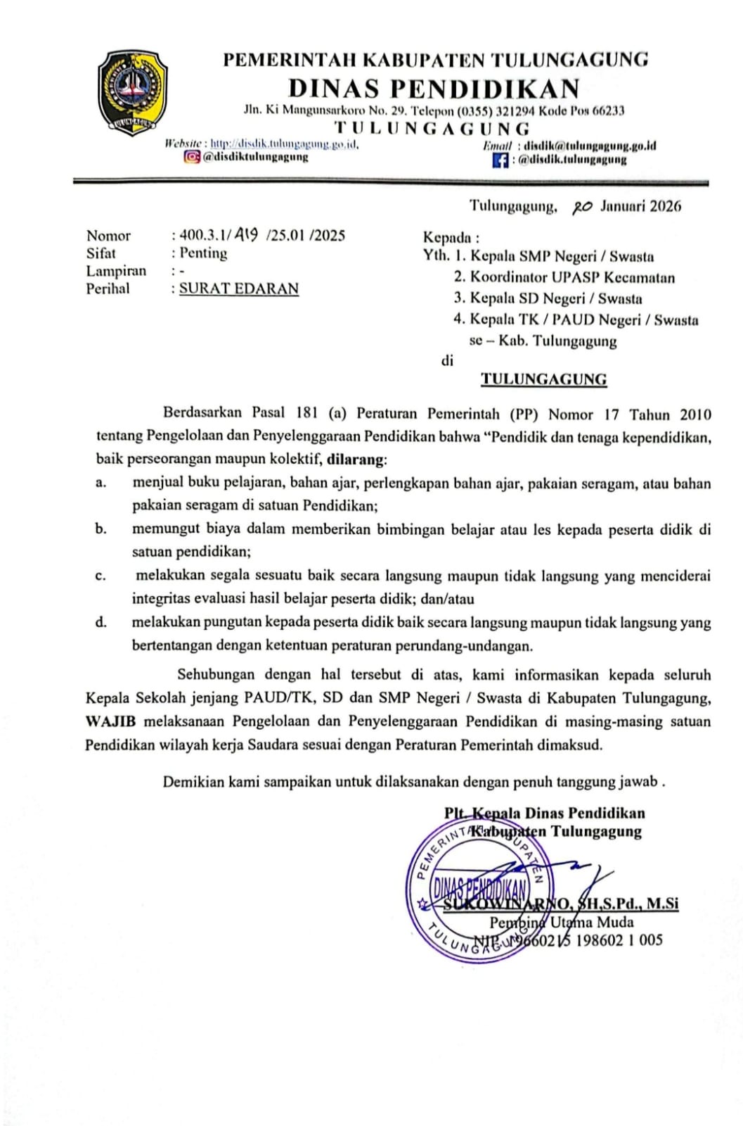 Plt Kepala Dinas Pendidikan Tulungagung, Sukowinarno, meneken langsung Surat Edaran Nomor 400.3.1/419/25.01/2025. Isinya tak main-main: seluruh sekolah, dari PAUD hingga SMP, baik negeri maupun swasta, dilarang keras melakukan jual beli perlengkapan sekolah dan memungut biaya ilegal.