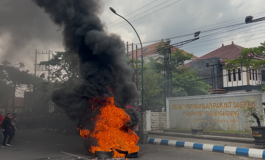 TULUNGAGUNG — Asap hitam membubung tinggi dari ban-ban yang dibakar massa di depan kantor DPRD Tulungagung, pada Senin 6 Oktober 2025 siang.
