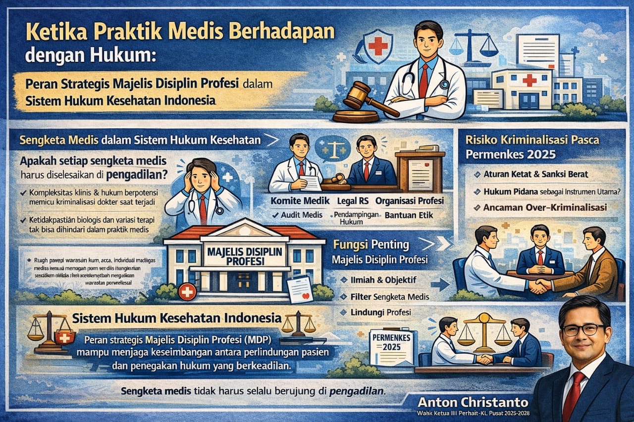 Sengketa medis tidak seharusnya selalu berakhir di ruang sidang. Sistem Hukum Kesehatan Indonesia yang berkeadilan harus menempatkan Majelis Disiplin Profesi sebagai pilar utama dalam menjaga keseimbangan antara perlindungan pasien dan perlindungan profesi dokter.