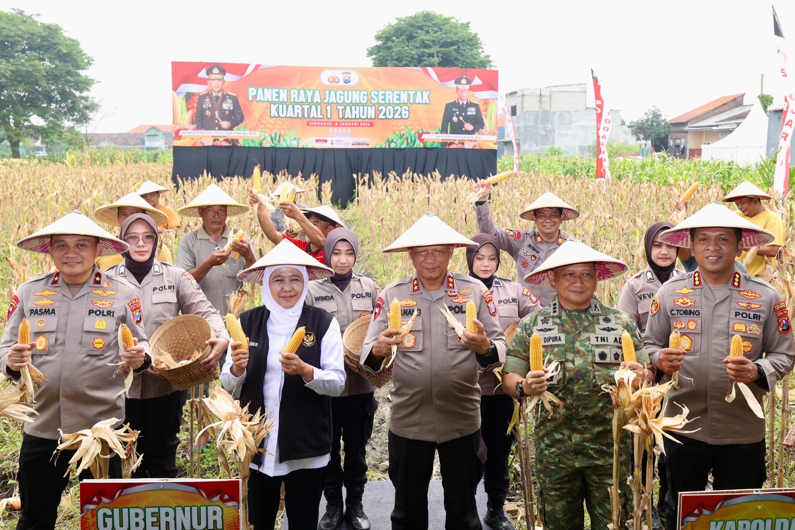 SIDOARJO— Kepolisian Daerah Jawa Timur menggelar Panen Raya Jagung Serentak Kuartal IV Tahun 2025–2026 sebagai wujud dukungan terhadap program Swasembada Pangan Nasional.