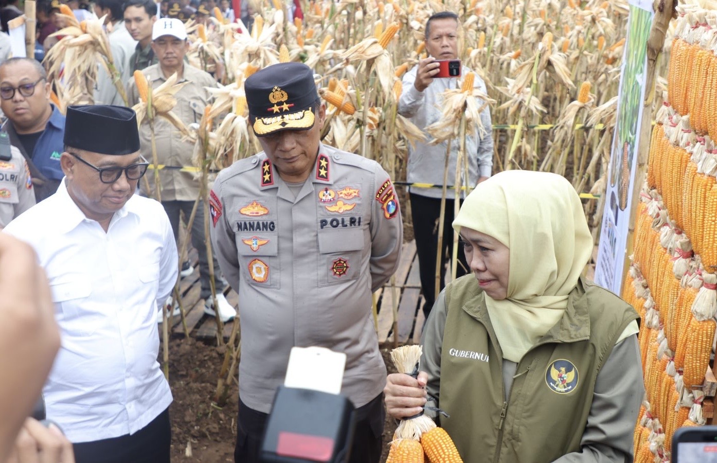 Banyuwangi— Kapolda Jawa Timur, Irjen Pol. Drs. Nanang Avianto, M.SI, bersama Gubernur Jawa Timur Khofifah Indar Parawansa melaksanakan panen raya Jagung di kawasan Pusat Pelatihan Pertanian Taruna Bumi, Green Farm Banyuwangi, Jawa Timur, Sabtu (28/2/2026).