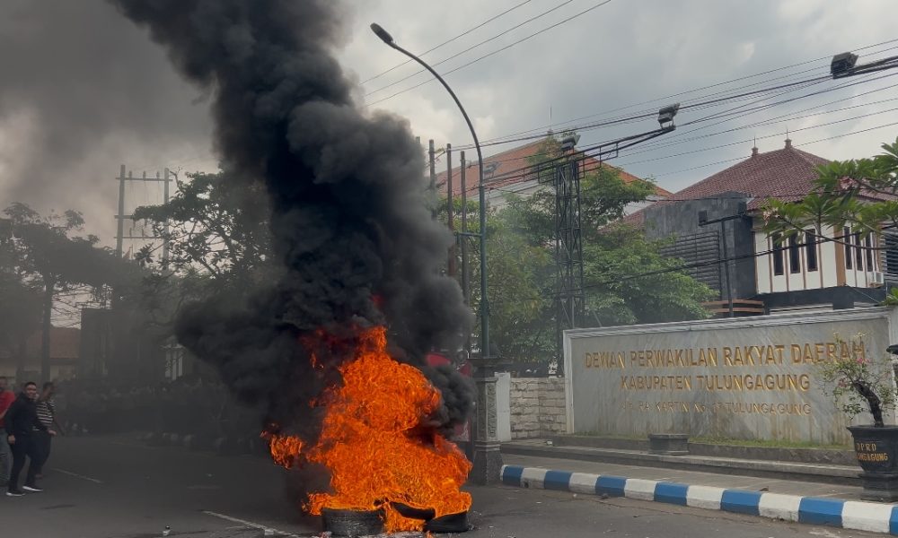TULUNGAGUNG — Asap hitam membubung tinggi dari ban-ban yang dibakar massa di depan kantor DPRD Tulungagung, pada Senin 6 Oktober 2025 siang. Ratusan massa dari kelompok...