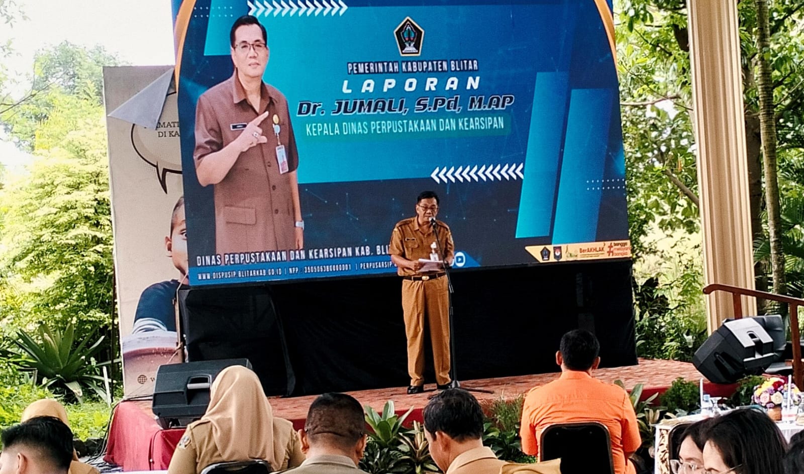 Kepala Disperpusip Kabupaten Blitar, Jumali, saat menyampaikan laporan kegiatan. (dok/JK).