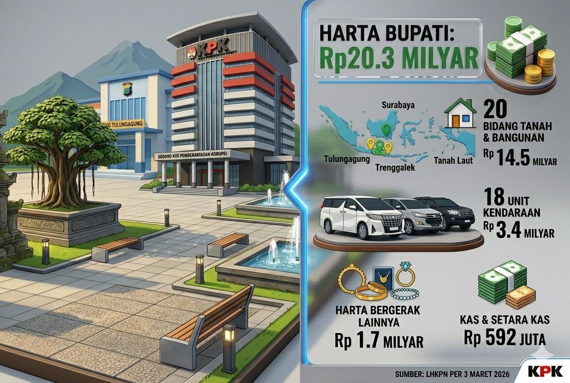 • 20 bidang tanah dan bangunan yang tersebar di Tulungagung, Trenggalek, Surabaya, hingga Tanah Laut (Kalimantan Selatan), dengan total nilai Rp 14.532.711.000.