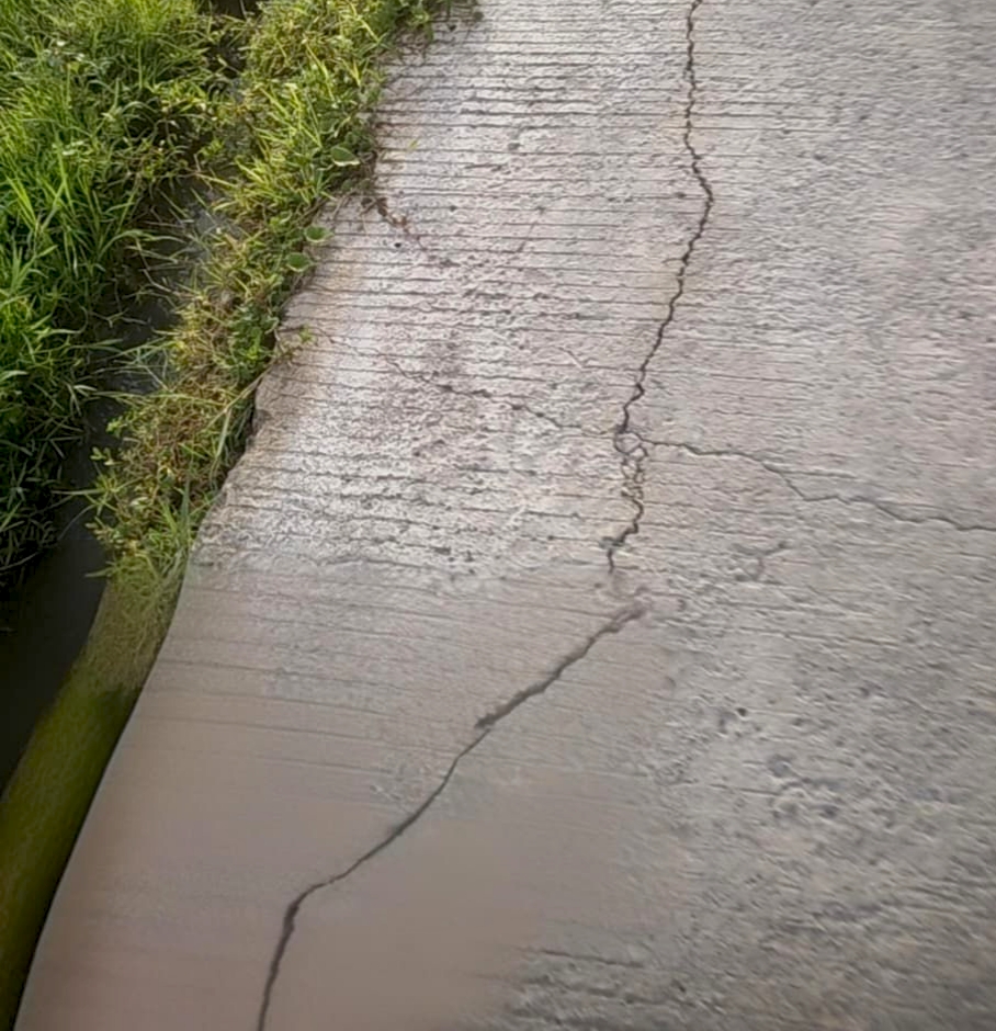 Belum genap enam bulan usai pengerjaan, jalan itu sudah compang-camping, diwarnai retakan lebar, patahan, dan amblesan di berbagai titik.