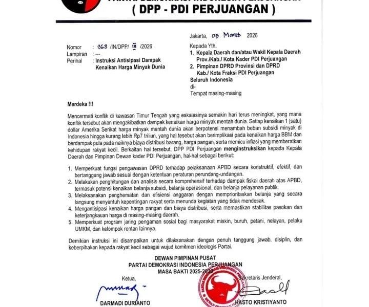Jakarta— Dewan Pimpinan Pusat Partai Demokrasi Indonesia Perjuangan (PDIP) mengeluarkan instruksi resmi kepada seluruh kepala daerah dan pimpinan fraksi partai di daerah untuk mengantisipasi dampak kenaikan...