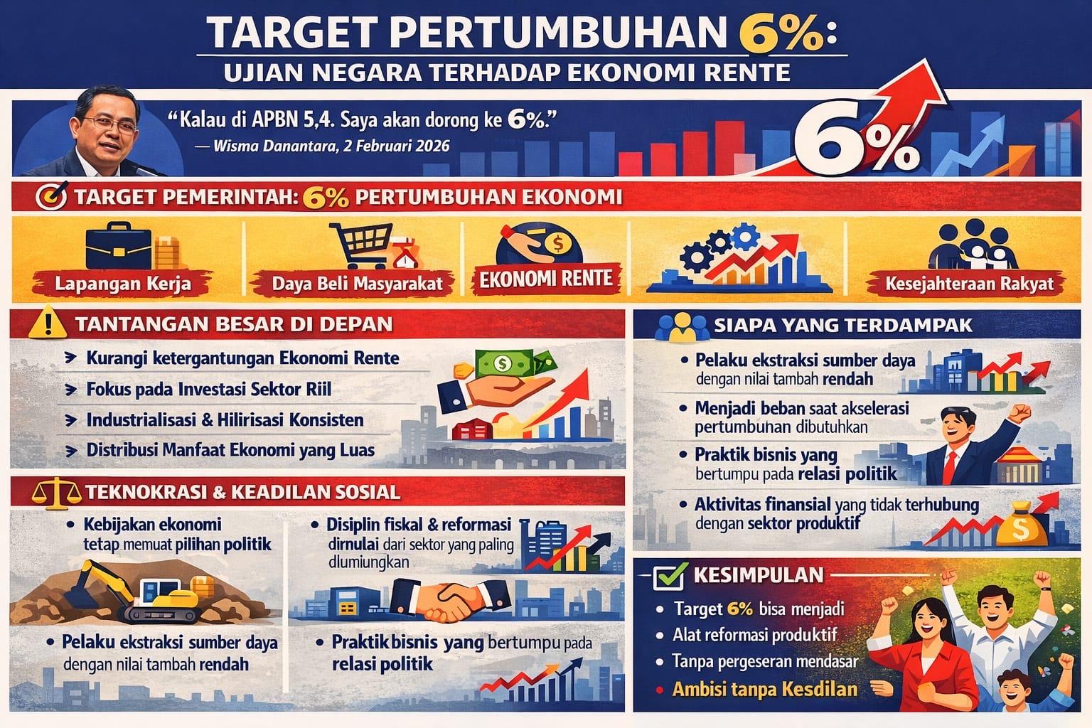 Dengan demikian, target 6 persen menjadi ujian nyata bagi komitmen pemerintah untuk menggeser ekonomi dari model rente menuju ekonomi produktif.